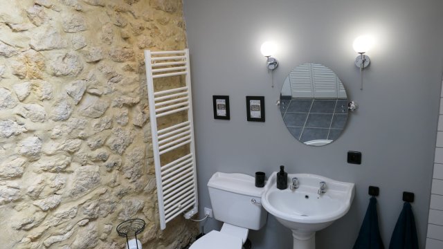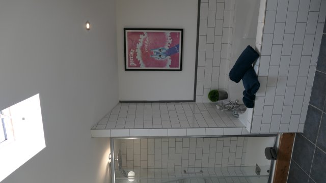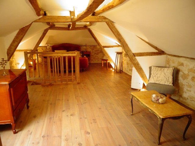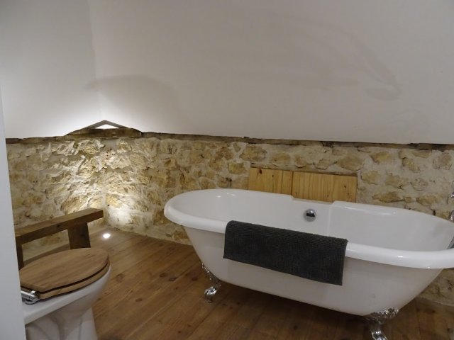 De bovenverdieping is een verbouwd authentiek sfeervolle loft met een tweepersoon bed en badkamer en-suite met ligbad op pootjes, toilet en wastafel. Op deze verdieping is het authentieke lage balkenplafond in ere hersteld.
